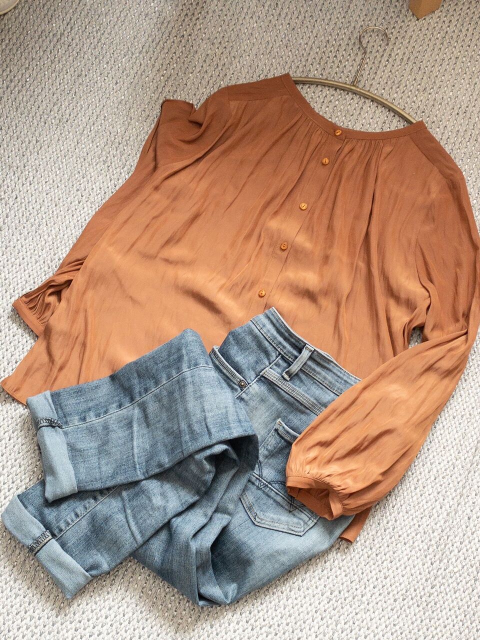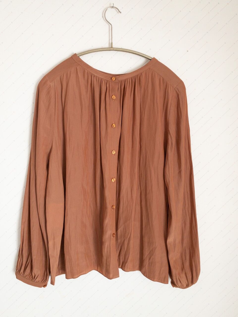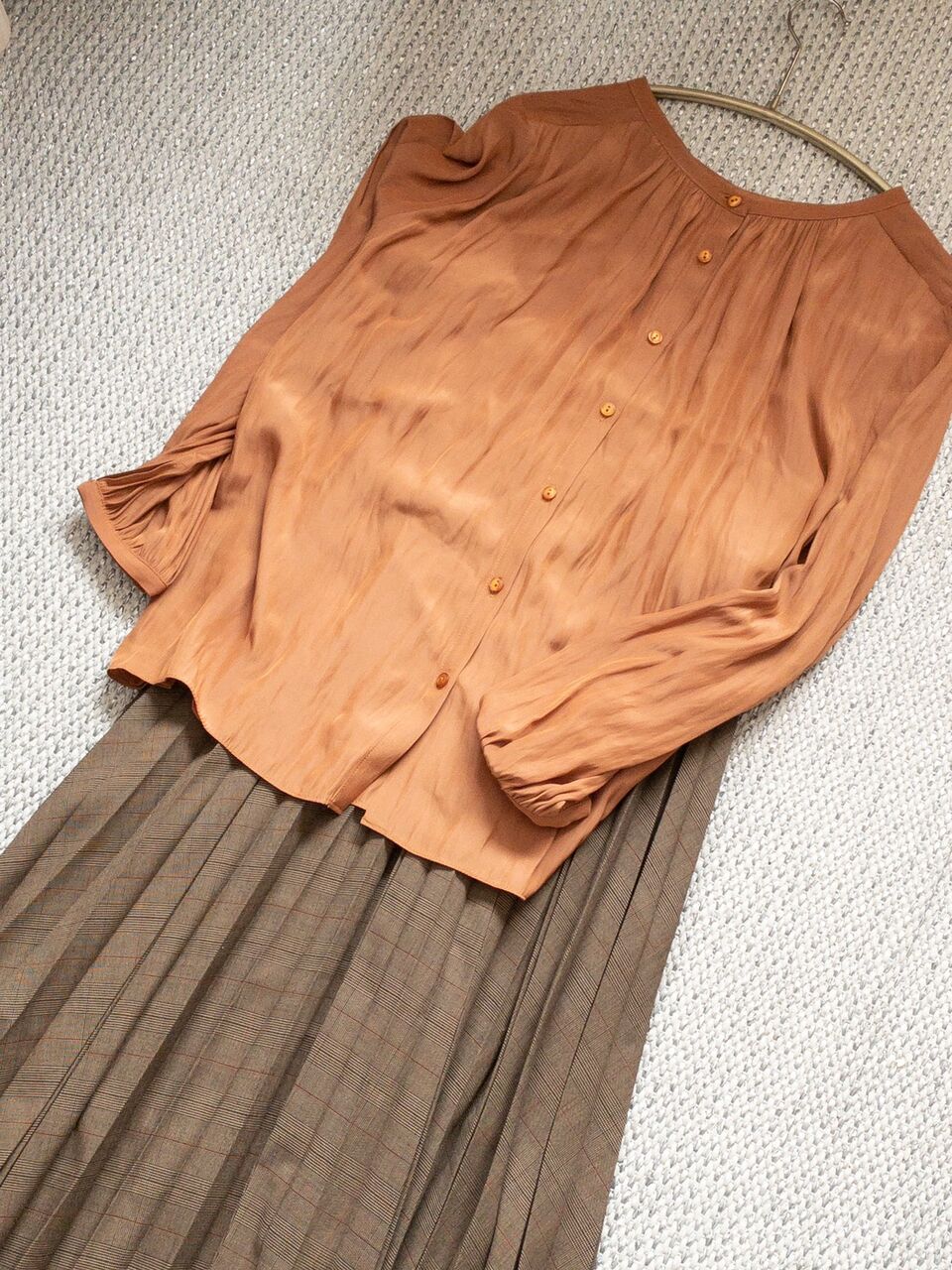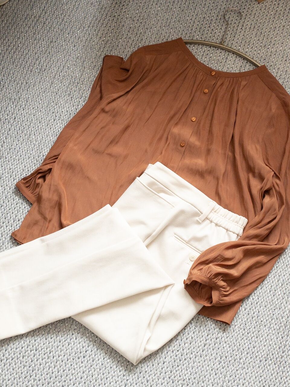 首元にギャザーがあって、さらりとした落ち感のあるブラウスです。